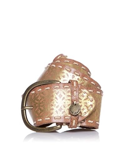 Cintura in pelle con stampa dorata, profilo impunturato e fibbia ad ardiglione in metallo effetto invecchiato. Altezza: 6 cm.