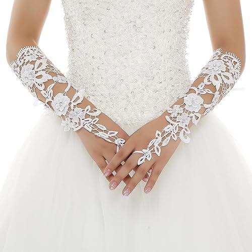 Vivian’s Bridal Guanti da Sposa Lunghi ad Anello senza Dita Fiori Diamanti Artificiali in Pizzo Merletto Bianco